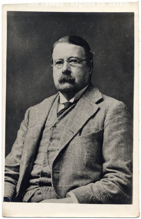 Ex Console Inglese - Ritratto: in studio; mezzo busto, frontale - Uomo: con baffi, occhiali - Vestiario: giacca e gilét a quadretti, camicia, cravatta - Sfondo