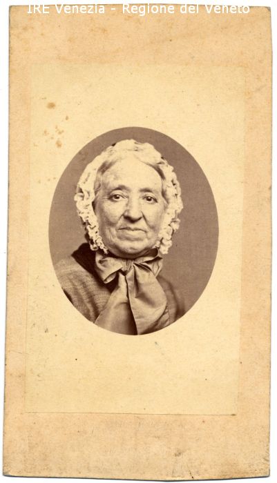Ritratto di Luigia Bossi - Ritratto: in studio, mezzo busto, frontale - Donna: anziana - Vestiario: abito con colletto scuro, cuffia con fiocco - Sfondo