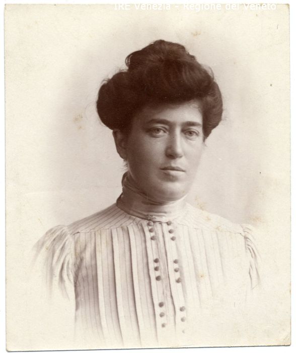 Cecilia Tiboni - Ritratto: in studio, mezzo busto, frontale - Donna - Acconciatura: capelli raccolti - Vestiario: camicia a righe, colletto a fascetta, bottoni - Sfondo