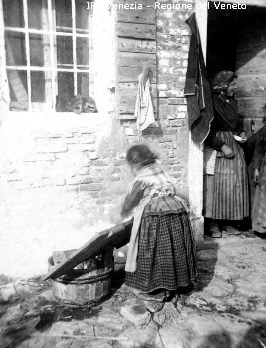 Venezia - Vita veneziana e lagunare - Territorio di Chioggia - Scene di vita quotidiana - Una bambina: di spalle; che lava - Un mastello - Uscio di abitazioni