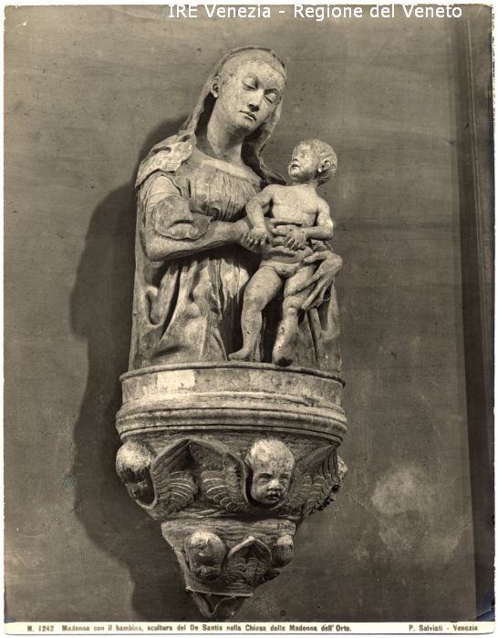 - ISCRIZIONI sul recto: in basso - N. 1242/ Madonna con il bambino, scultura del De Santis nella Chiesa della Madonna dell'Orto./ P. Salviati - Venezia - a matita -