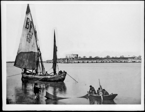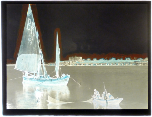 Lato dell'emulsione: rosso coprente lungo il confine dell'immagine col cielo. Maschera di velatura con blu attinico sulle alte luci (bragozzo, barca e Forte S. Andrea) e vernice per fissare i pigmenti. Su tutti e quattro i lati i bordi sono mascherati con carta nera. Dorso: mascheratura del cielo con carta nera.