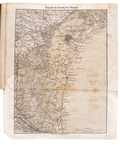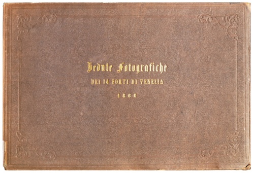 "Le foto fanno parte di un album la cui legatura coeva in tela marrone reca sul piatto anteriore il titolo impresso in oro entro una cornice a secco, decorata sui quattro angoli. Le stampe all'albumina montate sui cartoni, sono precedute da una carta geografica ripiegata sulla quale sono segnate in matita rossa le postazioni dei forti della laguna. In testa alla carta il titolo: Gegejnd von Venedig bis Chioggia", scala 1:86.400, Druck v. Verlag v. C. Flemming in Gloau [sic], 430x320 mm. Sul recto di alcuni cartoni e sul verso di altri sono segnati a matita i nomi dei forti" [Munari, Angela in Talamo 2007:190]. "[...] Album spaginato la cui legatura, in tela marrone, reca nella copertina il titolo sopra riportato ed impresso in oro entro una cornice a secco lineare con fregi agli angoli" [Miraglia 1982:327]. Alle tavole fotografiche è "anteposta una carta geografica ripiegata sulla quale sono segnate, a matita rossa, le postazioni e i forti della laguna veneta" [Miraglia 1982:327]. La cartina (460x382 mm) riporta le seguenti scritte sul recto: "Gegend von Venedig bis Chioggia/ scala 1:86.400/ Druck u. Verlag v. C. Flemming in Glogau. Sul verso della cartina è presente l'iscrizione manoscritta a penna: [Banco] Stampe/ XXXVIII, 15. Inoltre, ciascun documento fotografico reca sul verso del supporto secondario una titolazione manoscritta a matita successiva a quella originaria, spesso illegibile perché tagliata o mancante, manoscritta a matita sul recto del supporto secondario, in basso a destra.