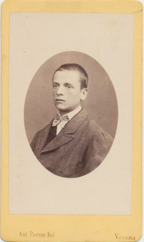 - STEMMI sul supporto secondario: verso: al centro - dell'autore - Marchio - Marchio dell'autore con la scritta "Antonio Perini/ Fotografo/ Premiato all'esposizioni universali/ di/ Parigi e Brusselles" e le riproduzioni delle medaglie ottenute presso le menzionate Esposizioni Universali. Vi sono inoltre riportati i due indirizzi degli stabilimenti del fotografo: "Antonio Perini Fotografo. Verona, S. Andrea 1° Piano, n. 1441" e "Antonio Perini Fotografo. Venezia, Calle Larga Ponte dell'Angelo, n. 403".