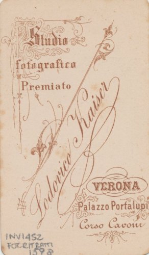 - STEMMI Sul supporto secondario: verso - dell'autore - Marchio - Marchio tipografico dell'autore in cui, entro un'elegante decorazione, si trova la scritta: "Studio fotografico/ premiato/ Lodovico Kaiser/ Verona/ Palazzo Portalupi Corso Cavour".