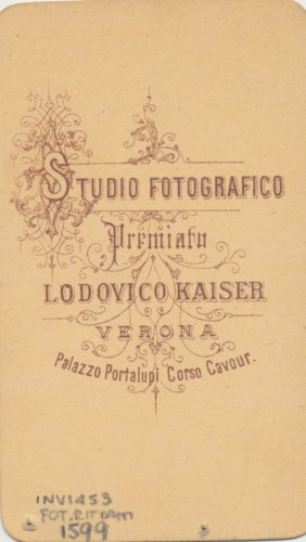 - STEMMI sul supporto secondario: verso - dell'autore - Marchio - Marchio tipografico dell'autore in cui, entro un'elegante decorazione, si trova la scritta: "Studio fotografico/ premiato/ Lodovico Kaiser/ Verona/ Palazzo Portalupi Corso Cavour".