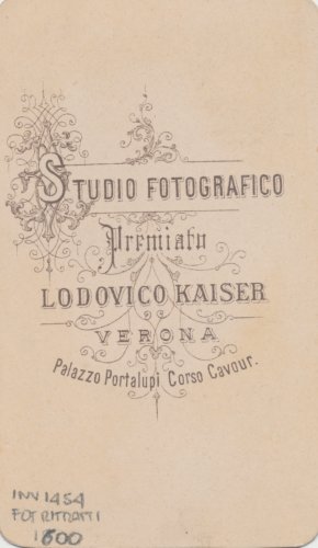 - STEMMI sul supporto secondario: verso - dell'autore - Marchio - Marchio tipografico dell'autore in cui, entro un'elegante decorazione, si trova la scritta: "Studio fotografico/ premiato/ Lodovico Kaiser/ Verona/ Palazzo Portalupi Corso Cavour".