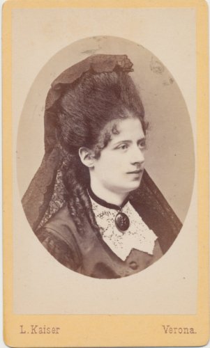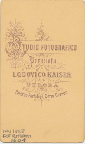 - STEMMI sul supporto secondario: verso - dell'autore - Marchio - Marchio tipografico dell'autore in cui, entro un'elegante decorazione, si trova la scritta: "Studio fotografico/ premiato/ Lodovico Kaiser/ Verona/ Palazzo Portalupi Corso Cavour".