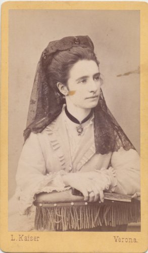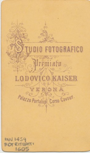 - STEMMI sul supporto secondario: verso - dell'autore - Marchio - Marchio tipografico dell'autore in cui, entro un'elegante decorazione, si trova la scritta: "Studio fotografico/ premiato/ Lodovico Kaiser/ Verona/ Palazzo Portalupi Corso Cavour".