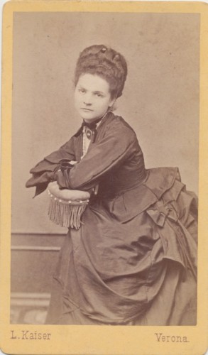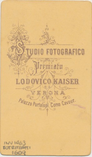 - STEMMI sul supporto secondario: verso - dell'autore - Marchio - Marchio tipografico dell'autore in cui, entro un'elegante decorazione, si trova la scritta: "Studio fotografico/ premiato/ Lodovico Kaiser/ Verona/ Palazzo Portalupi Corso Cavour".