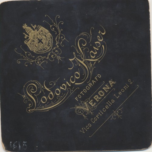 - STEMMI sul supporto secondario: recto - dell'autore - Marchio - Marchio tipografico dell'autore in inchiostro color oro, su sfondo nero, che riporta la scritta: "Lodovico Kaiser/ Fotografo/ Verona/ Vico Corticella Leoni 2".