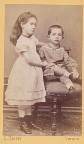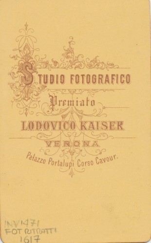 - STEMMI sul supporto secondario: verso - dell'autore - Marchio - Marchio tipografico dell'autore in cui, entro un'elegante decorazione, si trova la scritta: "Studio fotografico/ premiato/ Lodovico Kaiser/ Verona/ Palazzo Portalupi Corso Cavour".