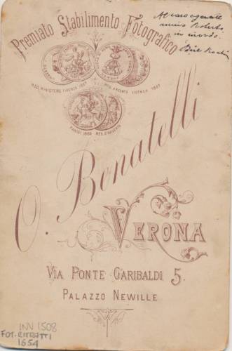 - STEMMI Sul supporto secondario: verso - dell'autore - Marchio - Marchio dell'autore con la scritta "Premiato stabilimento Fotografico/ O. Benatelli/ Verona/ Via Ponte Garibaldi, 5/ Palazzo Newille" e la riproduzione delle medaglie ottenute a Parigi, Firenze e Vicenza.