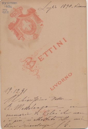 - STEMMI Sul supporto secondario: verso - dell'autore - Marchio - Marchio dell'autore comprendente uno stemma crociato ed incoronato e la scritta "Bettini/ Livorno".