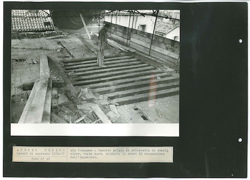 Ateneo Veneto Lavori di restauro 1956-57: foto n° 48: Ala Tommaseo - Vecchio solaio di sottotetto in demolizione, verso nord. Evidente lo stato di consunzione dellimpalcato.