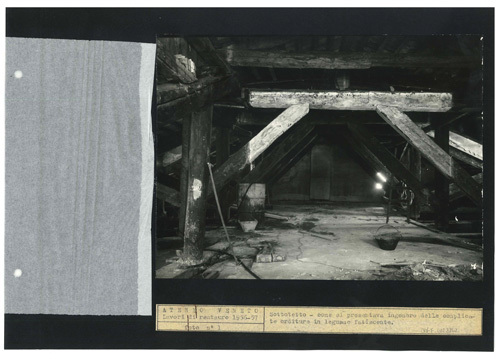 Ateneo Veneto Lavori di restauro 1956-57: foto n° 1: Sottotetto - come si presentava ingombro della complicata orditura in legname fatiscente.