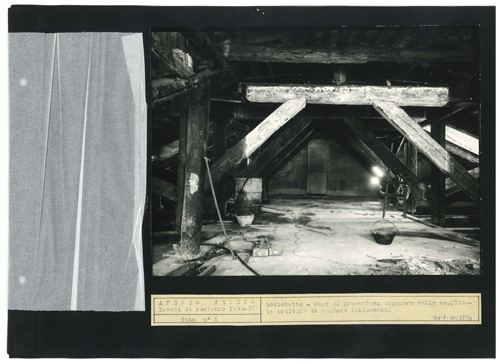 Ateneo Veneto Lavori di restauro 1956-57: foto n° 1: Sottotetto - come si presentava ingombro della complicata orditura in legname fatiscente.