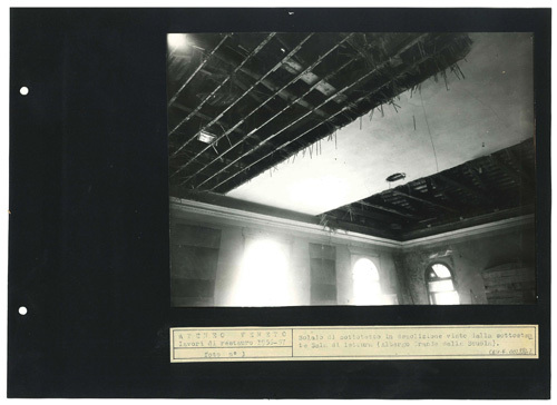Ateneo Veneto Lavori di restauro 1956-57: foto n° 3: Solaio di sottotetto in demolizione visto dalla sottostante Sala di lettura (Albergo Grande della Scuola).