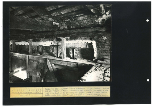 Ateneo Veneto Lavori di restauro 1956-57: foto n° 8: Opera di collegamento nelle murature di perimetro. Sostegno provvisorio delle orditure del vecchio coperto e ricavo con taglio in breccia ed apposizione di martinetti della sede del progettato cordolo di collegamento.