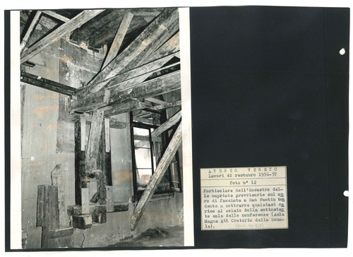 Ateneo Veneto Lavori di restauro 1956-57: foto n° 12: Particolare dell'incastro delle capriate provvisorie sul muro di facciata a San Fantin tendente a sottrarre qualsiasi carico al solaio della sottostante sala delle conferenze (Aula Magna già Oratorio della Scuola).