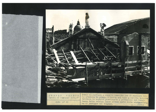 Ateneo Veneto Lavori di restauro 1956-57: foto n° 15: Ponte di servizio a coperto demolito per il restauro della grondaia in pietra d'Istria sul lato a cortile interno. Orditura di coperto provvisorio a protezione del locale Banca della Scuola. Sullo sfondo parte della sbadacchiatura di sostegno del timpano.