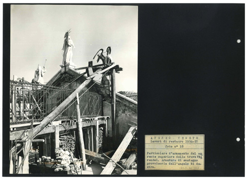 Ateneo Veneto Lavori di restauro 1956-57: foto n° 18: Particolare d'armamento del corrente superiore della trave Vierendel. Armatura di sostegno provvisoria dell'angelo di destra.