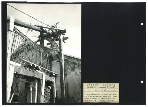Ateneo Veneto Lavori di restauro 1956-57: foto n° 20: Trave Vierendel - particolare dell'innesto sul muro del timpano e scorcio dell'opera di sostegno dell'angelo destro.