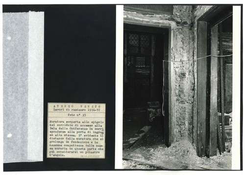 Ateneo Veneto Lavori di restauro 1956-57: foto n° 35: Muratura scoperta allo spigolo nel corridoio di accesso alla Sala delle Conferenze in corrispondenza alla porta di ingresso alla stessa. E evidente il distacco della muratura che si prolunga in fondazione e la nessuna compattezza della massa muraria in questa parte che può considerarsi un pilastro dangolo.