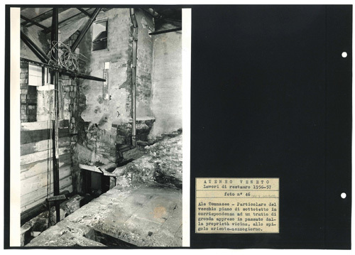 Ateneo Veneto Lavori di restauro 1956-57: foto n° 46: Ala Tommaseo - Particolare del vecchio piano di sottotetto in corrispondenza ad un tratto di gronda appreso in passato dalla proprietà vicina, allo spigolo oriente-mezzogiorno.