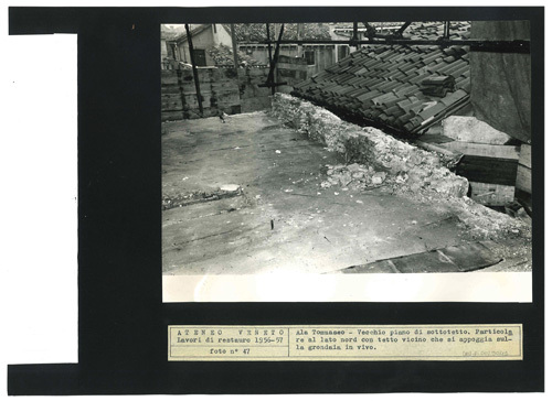 Ateneo Veneto Lavori di restauro 1956-57: foto n° 47: Ala Tommaseo - Vecchio piano di sottotetto. Particolare al lato nord con tetto vicino che si appoggia sulla grondaia in vivo.