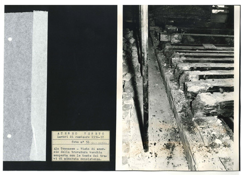 Ateneo Veneto Lavori di restauro 1956-57: foto n° 51: Ala Tommaseo - Vista di scorcio della travatura vecchia scoperta con le teste dei travi di minorata consistenza.