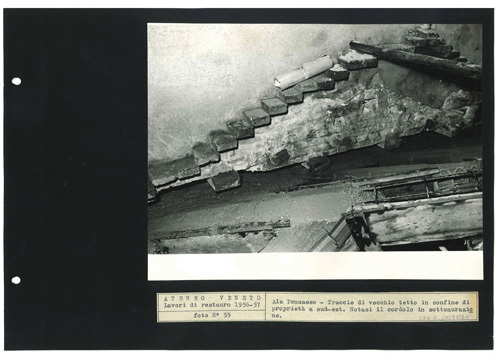 Ateneo Veneto Lavori di restauro 1956-57: foto n° 55: Ala Tommaseo - Traccie di vecchio tetto in confine di proprietà a sud-est. Notasi il cordolo in sottomurazione.
