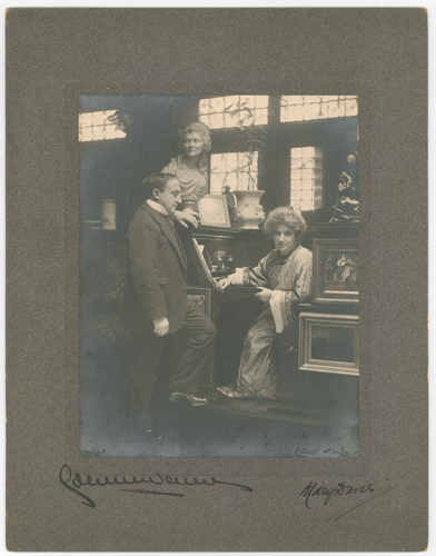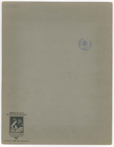 - STEMMI supporto secondario: verso: in basso a sinistra - dell'autore - Marchio - Mills, Ernest H. - marchio ad inchiostro nero con la scritta a lettere capitali: Ernest H. Mills/ At-home-photographer/ 6, Stanley-Garden/ Hampstead/ N.W./ Telephone 1652 P.O. Hampstead. al centro disegno di una donna di spalle in posa di fronte a un banco ottico.