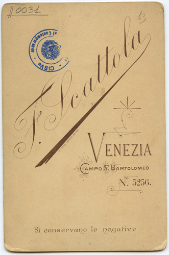 - ISCRIZIONI supporto secondario: recto: in basso - F. Scattola Venezia/ Campo S. Bartolomeo, 5256 - a matita -
