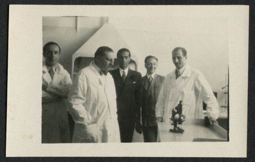 Carlo Pasinetti e altri medici in laboratorio con un microscopio