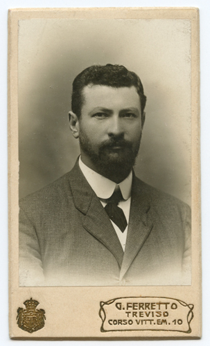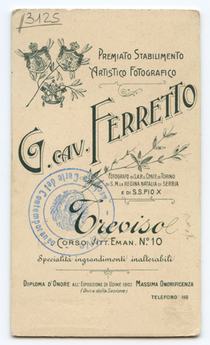• ISCRIZIONI supporto secondario: recto: in basso a destra - G. FERRETTO/ TREVISO/ corso VITT. EM. 10 - a matita -
