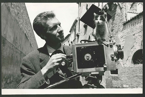 Francesco Pasinetti con macchina da presa e gatto