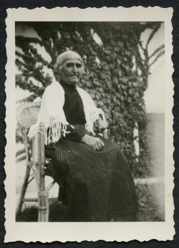 Anziana seduta su sedia di vimini