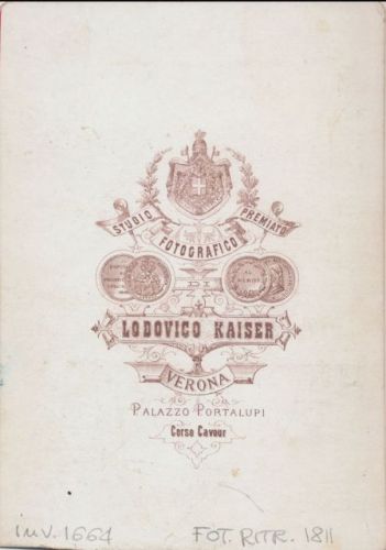 - STEMMI sul verso: al centro - commerciale - Marchio - 1 - Si legge la scritta "Studio fotografico premiato Lodovico Kaiser. Verona. Palazzo Portalupi. Corso Cavour" circondata dalle medaglie vinte