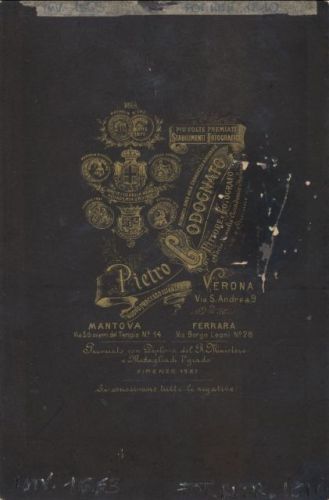- STEMMI sul recto: in basso - commerciale - Marchio - P.Codognato Verona Ferrara Mantova - 1 - A sinistra "P.Codognato", a destra "Verona-Ferrara-Mantova" a caratteri neri su fondo verde