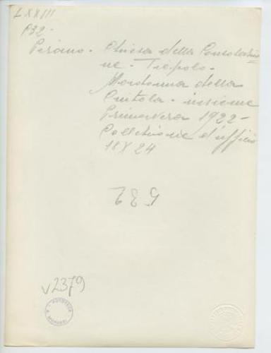 - ISCRIZIONI supporto primario: verso: in alto al centro - Pirano - Chiesa della Consolazio/ne. Tiepolo./ Madonna della/ Cintola, insieme/ Primavera 1922./ collezione d'ufficio/ 18x24 - a matita -