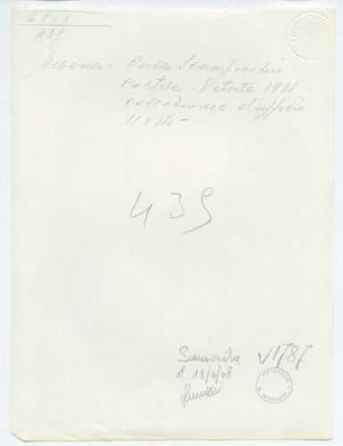 - NOTIZIE STORICO CRITICHE La fotografia fa parte dell'insieme archivistico denominato "Venezia Giulia" (tre cartelle: V. VIII, V. IX, V. X), nello specifico, è conservata all'interno della cartella V. VIII. E' stata realizzata nell'estate del 1921 da Pietro Opiglia, che dal 1908 al 1947, svolse il ruolo di fotografo presso il Museo Civico triestino e del quale si serviva l'Ufficio Belle Arti della Venezia Giulia durante le proprie campagne fotografiche. In questo caso, l'Ufficio Belle Arti aveva promosso una campagna ricognitiva circa le opere d'arte presenti sul territorio transfrontaliero che oggi comprende il Friuli Venezia Giulia, la Croazia e la Slovenia. Si ricorda, inoltre, che Antonio Morassi svolse il ruolo di funzionario sovrintendente presso l'Ufficio Belle Arti della Venezia Giulia dal 1920 al 1925.