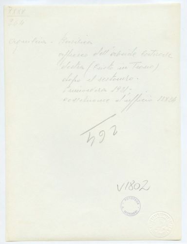 - NOTIZIE STORICO CRITICHE La fotografia fa parte dell'insieme archivistico denominato "Venezia Giulia" (tre cartelle: V. VIII, V. IX, V. X), nello specifico, è conservata all'interno della cartella V. VIII. E' stata realizzata nella primavera del 1921 da Pietro Opiglia, che dal 1908 al 1947, svolse il ruolo di fotografo presso il Museo Civico triestino e del quale si serviva l'Ufficio Belle Arti della Venezia Giulia durante le proprie campagne fotografiche. In questo caso, l'Ufficio Belle Arti aveva promosso una campagna ricognitiva circa le opere d'arte presenti sul territorio transfrontaliero che oggi comprende il Friuli Venezia Giulia, la Croazia e la Slovenia. Si ricorda, inoltre, che Antonio Morassi svolse il ruolo di funzionario sovrintendente presso l'Ufficio Belle Arti della Venezia Giulia dal 1920 al 1925.