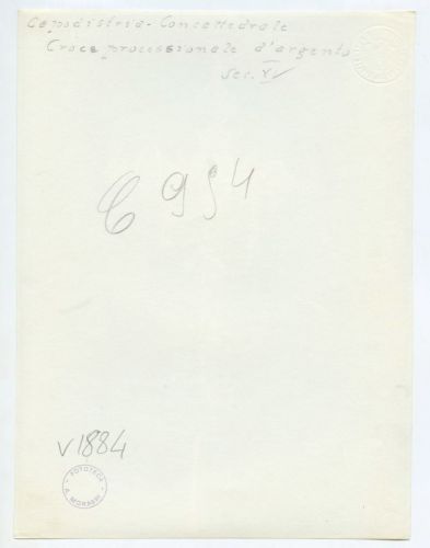 - ISCRIZIONI supporto primario: verso: in alto al centro - Capodistria - Concattedrale/ Croce processionale d'argento, sec. XV - a matita -