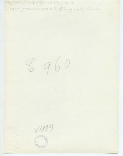 - ISCRIZIONI supporto primario: verso: in basso al centro - Capodistria - Concattedrale/ Croce processionale d'argento, sec. XV - a matita -