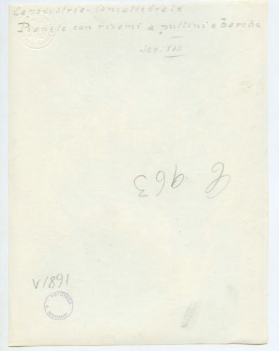 - ISCRIZIONI supporto primario: verso: in alto al centro - Capodistria - Concattedrale/ Pianeta con ricami a puttini e barche/ sec. XVII - a matita -