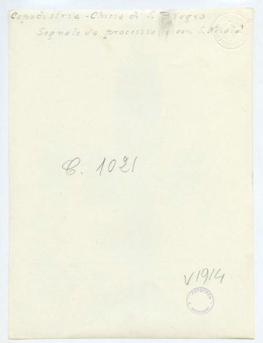 - ISCRIZIONI supporto primario: verso: in alto al centro - Capodistria - Chiesa di S. Biagio/ Segnale da processione con S. Nicolò - a matita -