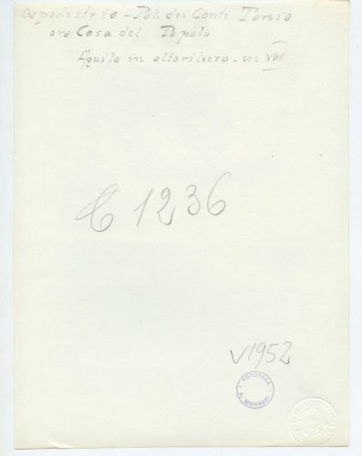 - ISCRIZIONI supporto primario: verso: in alto al centro - Capodistria - Pal. dei Conti Tarsia/ ora Casa del Popolo/ Aquila in altorilievo - sec. XVI - a matita -