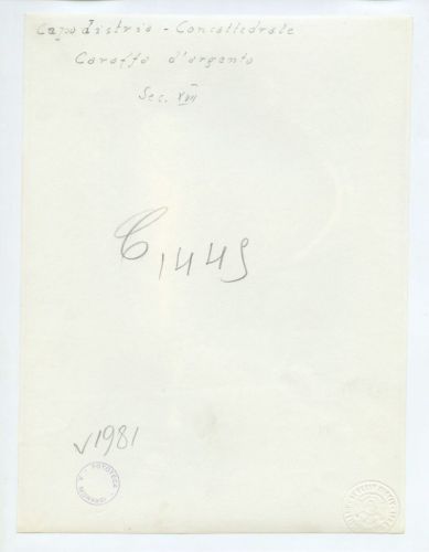 - ISCRIZIONI supporto primario: verso: in alto al centro - Capodistria - Concattedrale/ Caraffa d'argento/ Sec. XVII - a matita -