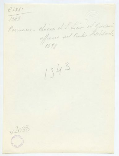 - ISCRIZIONI sul supporto primario: verso: in alto al centro - Cormons chiesa di Lucia o S. Giovanni/ affresco nel centro dell'abside - a matita -